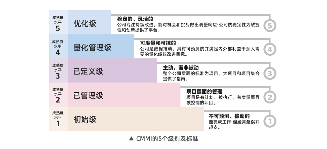 CMMI(Capability Maturity Model Integration)即軟件能力成熟度模型,是國際公認衡量企業軟件工程開發能力的評估標準,被稱為全球軟件領域內最具權威的軟件開發資質認證體系之一。CMMI共5個級別,分別是初始級、可管理級、已定義級、量化管理級和優化級。CMMI5為最高等級,通過CMMI5級認證代表企業在軟件研發中具有持續優化和創新的能力,能夠根據自身業務目標和價值需求,持續改善軟件研發過程各環節,在軟件開發和項目管理方面已達到高成熟度。