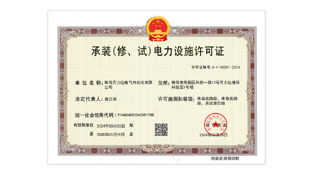 承裝(修、試)電力設(shè)施許可證是國家能源局對(duì)企業(yè)可從事電力行業(yè)活動(dòng)的資質(zhì)證明,承裝(修、試)電力設(shè)施許可證四級(jí)的取得,意味著萬力達(dá)電氣能夠承接35kV及以下電壓等級(jí)電力設(shè)施的安裝、維修和試驗(yàn)活動(dòng),拓寬了電力服務(wù)全流程,為全面開拓電氣智能化業(yè)務(wù)夯實(shí)基礎(chǔ)。
