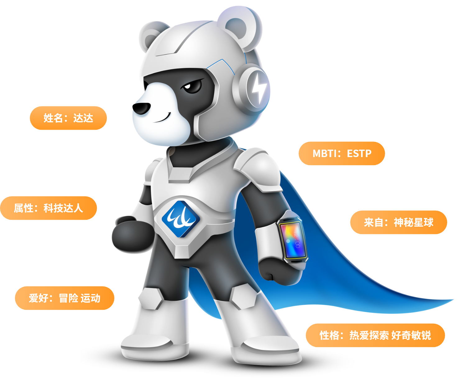 達達熊高大、威猛、強壯,代表了力量和勇氣,寓意著勇往直前、奮力拼搏的精神。一身科技機械風盔甲、搭配藍色披風描繪出工業領域電氣管理人員穩重而有朝氣的形象。